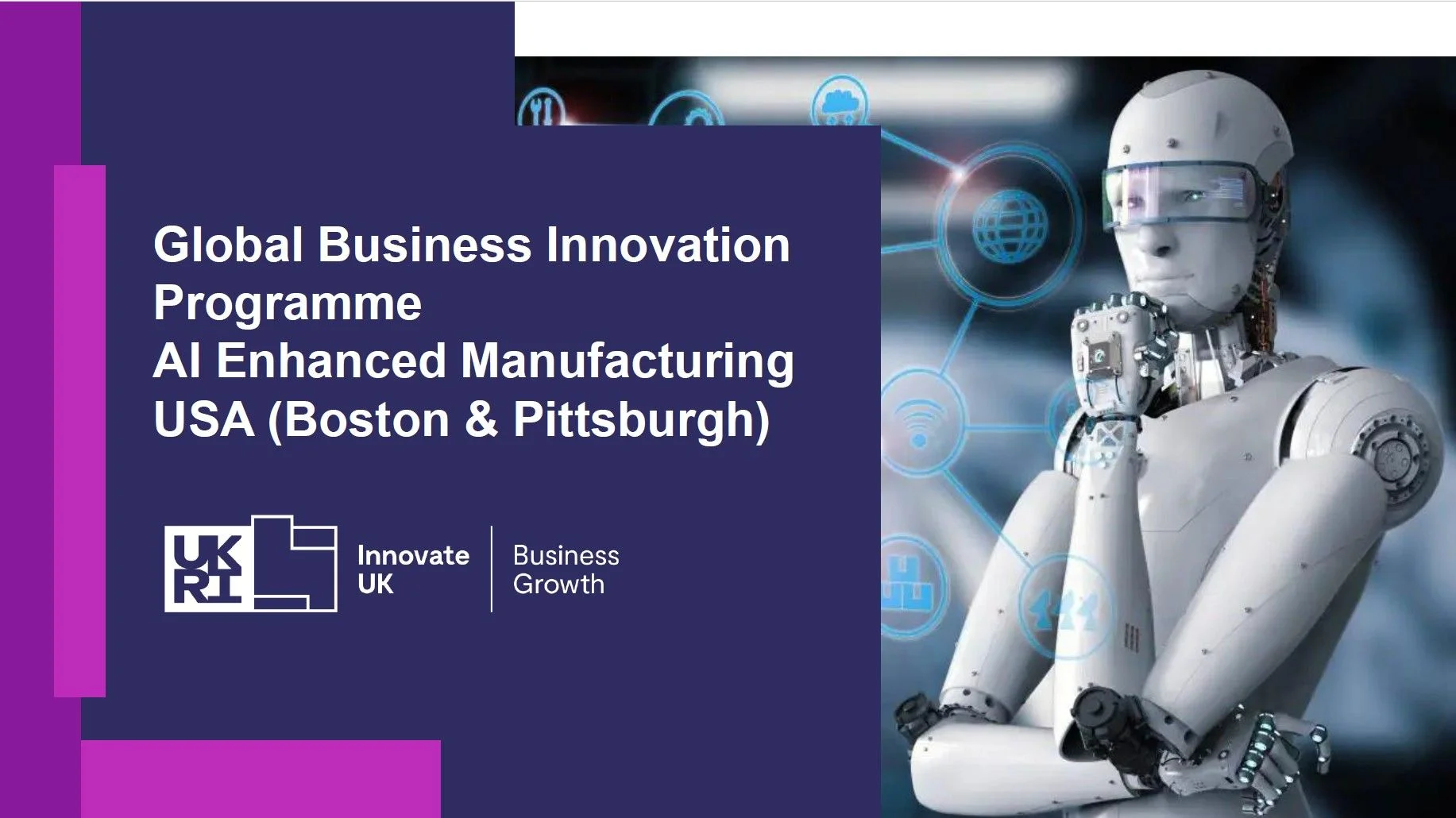 The Global Business Innovation Programme is delivered by Innovate UK Business Connect and is structured around three phases: a two-day preparation workshop covering market knowledge, intellectual property, and value proposition development; a five-day tailored in-market visit to Boston and Pittsburgh; and a final exploitation phase with dedicated one-to-one support from an Innovate UK innovation and growth specialist. Innovate UK funds and organises flights, accommodation, and in-market travel for all successful participants.